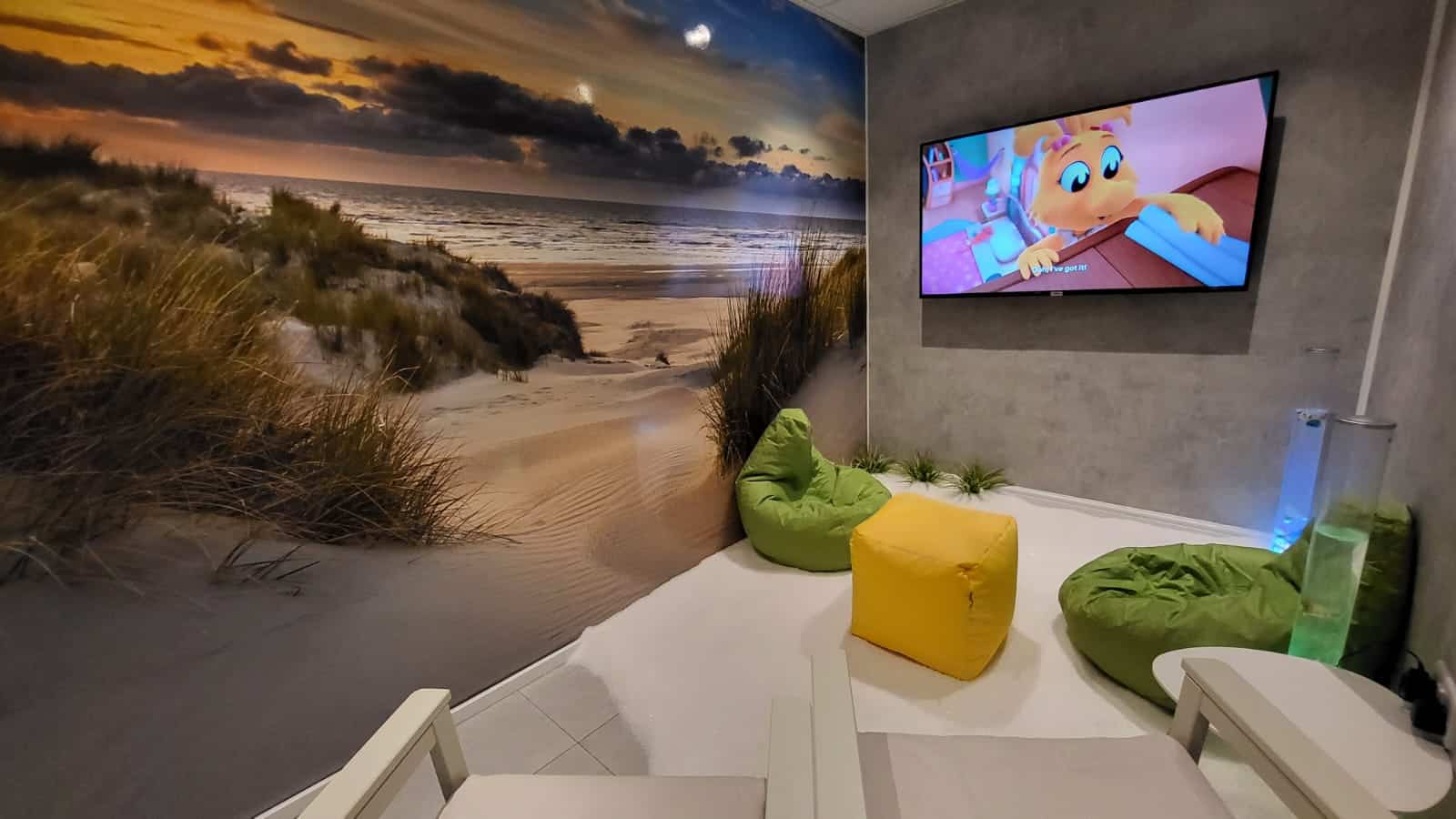 We provide buckets, spades & wheelbarrow’s to play in over 1 tonne of natural dry sea salt along with a 50-inch flat-screen TV, connected to Netflix to catch up on any available movies and tv shows to your liking. Alike our adult rooms, we welcome our clients to also bring their own toys, books and activities that can enhance their therapy experience.